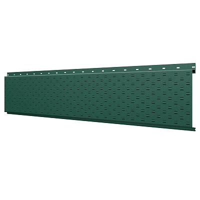 Линеарная потолочно-стеновая панель с ПЕРФОРАЦИЕЙ для вентиляции цвет RAL6005 Зеленый Мох Стальной Бархат применяется в качестве софитов для подшивы крыши, наружной и внутренней отделки потолков, стен, фронтонов фасада дома в Костанае.